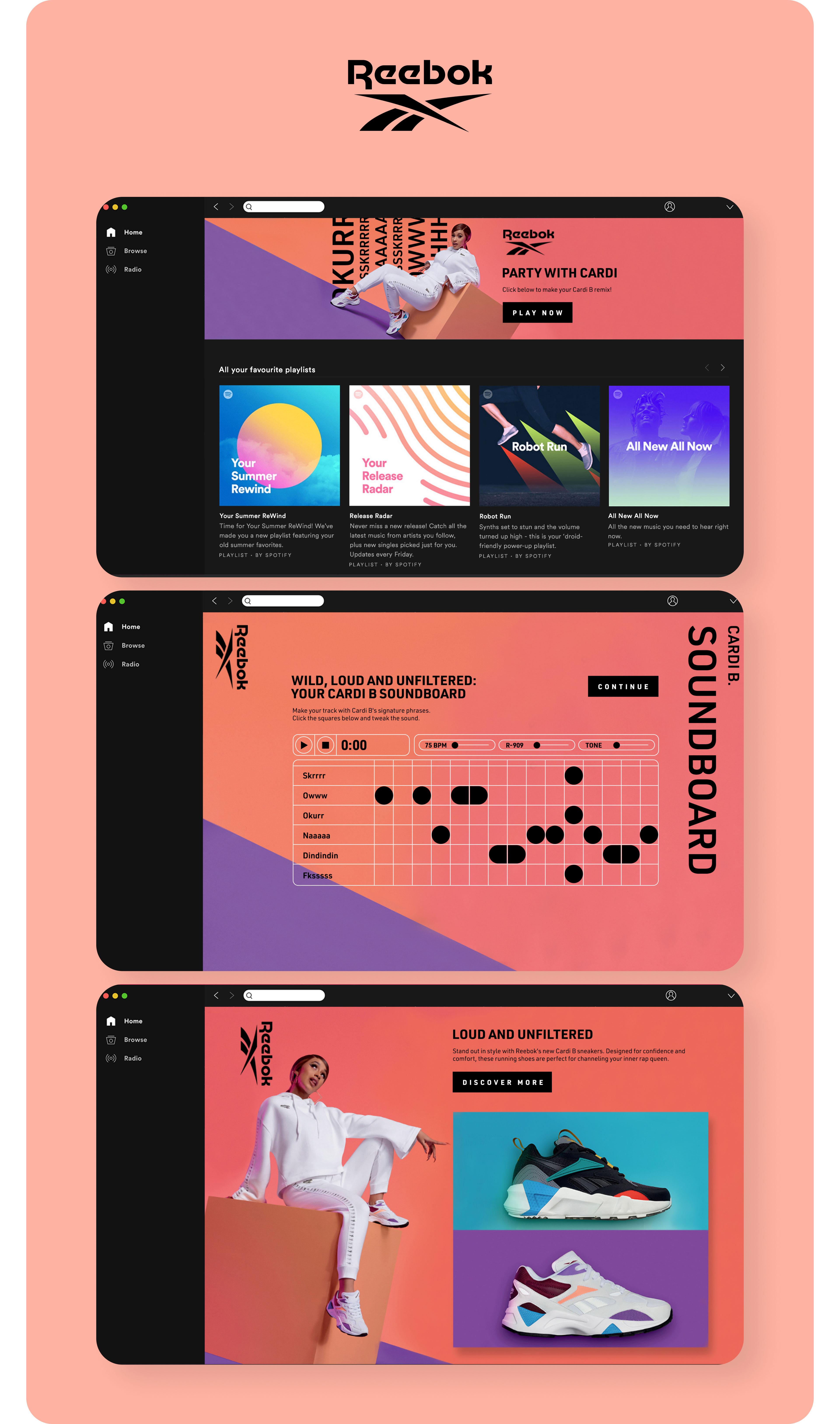In collaboration with Cardi B, Reebok is launching new Cardi B sneakers. To promote the release, we developed a homepage takeover concept featuring a soundboard filled with typical Cardi B noises from her hits. Users can interact with the soundboard, creating bespoke songs and sharing them. This engaging experience serves as a dual call-to-action, enticing users to explore and ultimately purchase the new shoes.