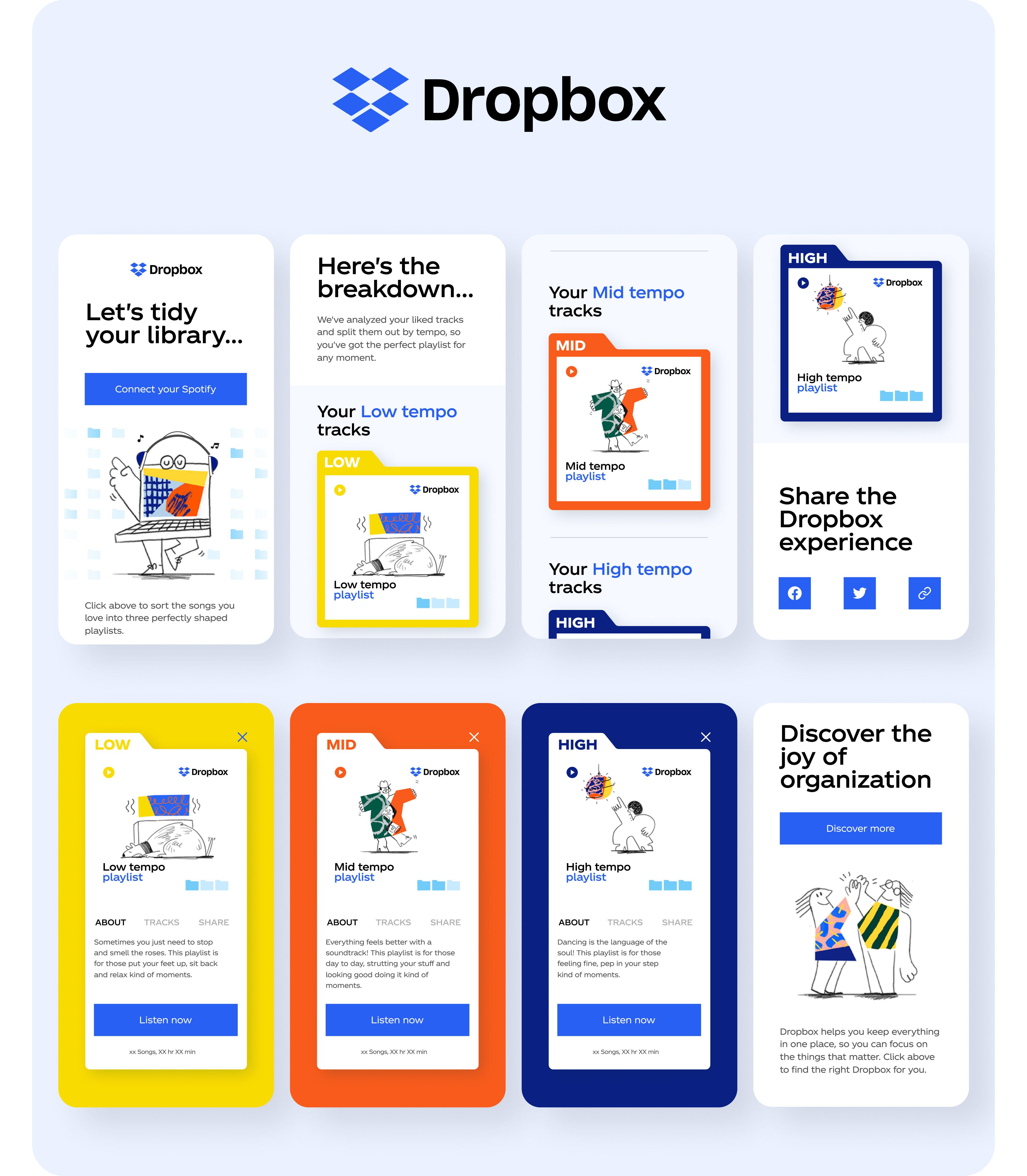 Upon connecting their Spotify account, users experience the convenience of having their music organized based on tempo speed into three distinct playlists. This concept seamlessly aligns with Dropbox's key message of discovering the joy in organization, translating the experience of keeping files tidy into the realm of music organization.