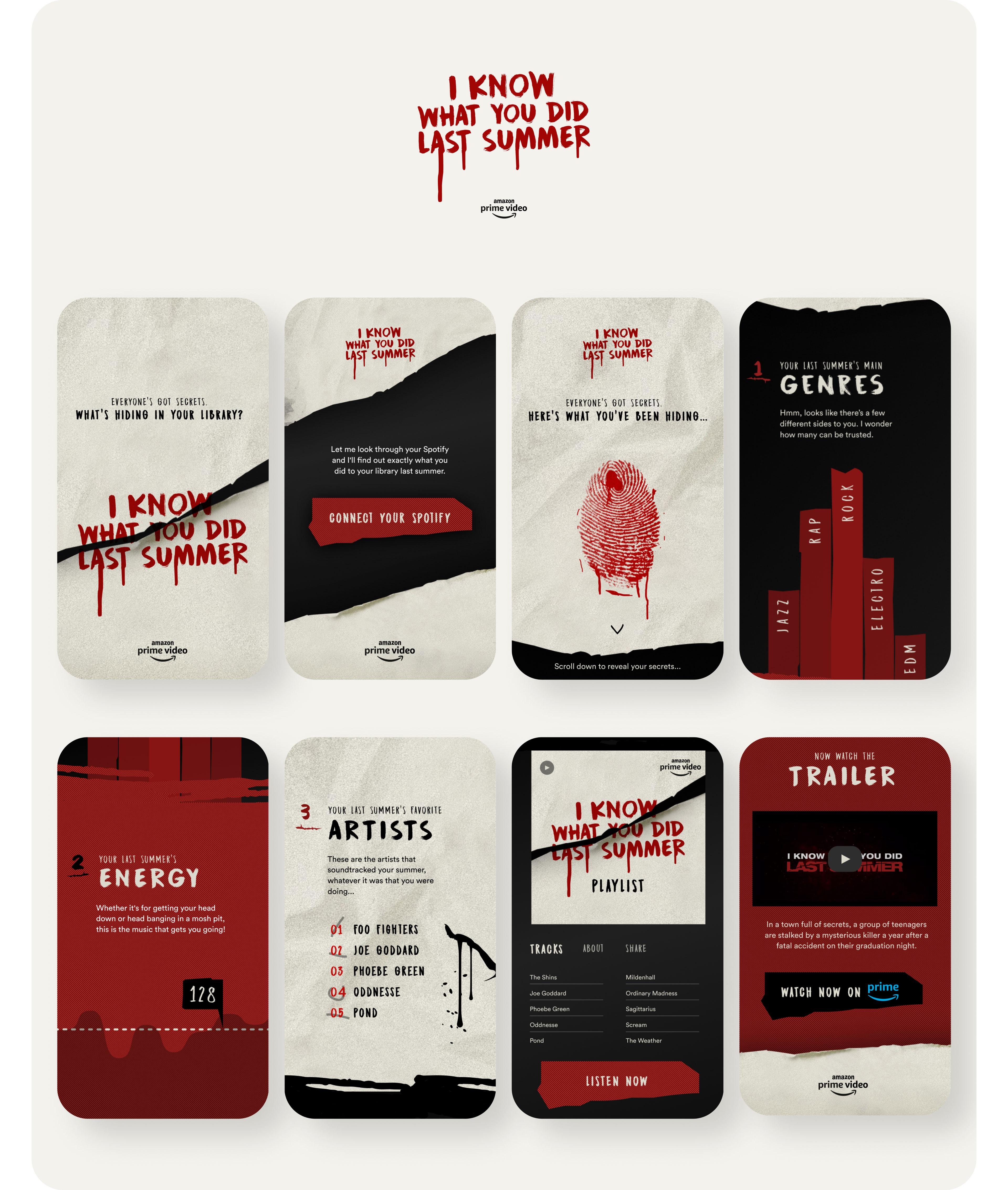 In line with the movie title, our team devised a campaign to analyze users' musical data and unveil what they were listening to the previous summer. By connecting their Spotify account, users have their musical data analyzed, receiving a breakdown of their previous summer in an intriguing and horror-styled infographic. Additionally, they receive a playlist of music from the previous summer and can watch the movie's trailer to further immerse themselves in the experience.