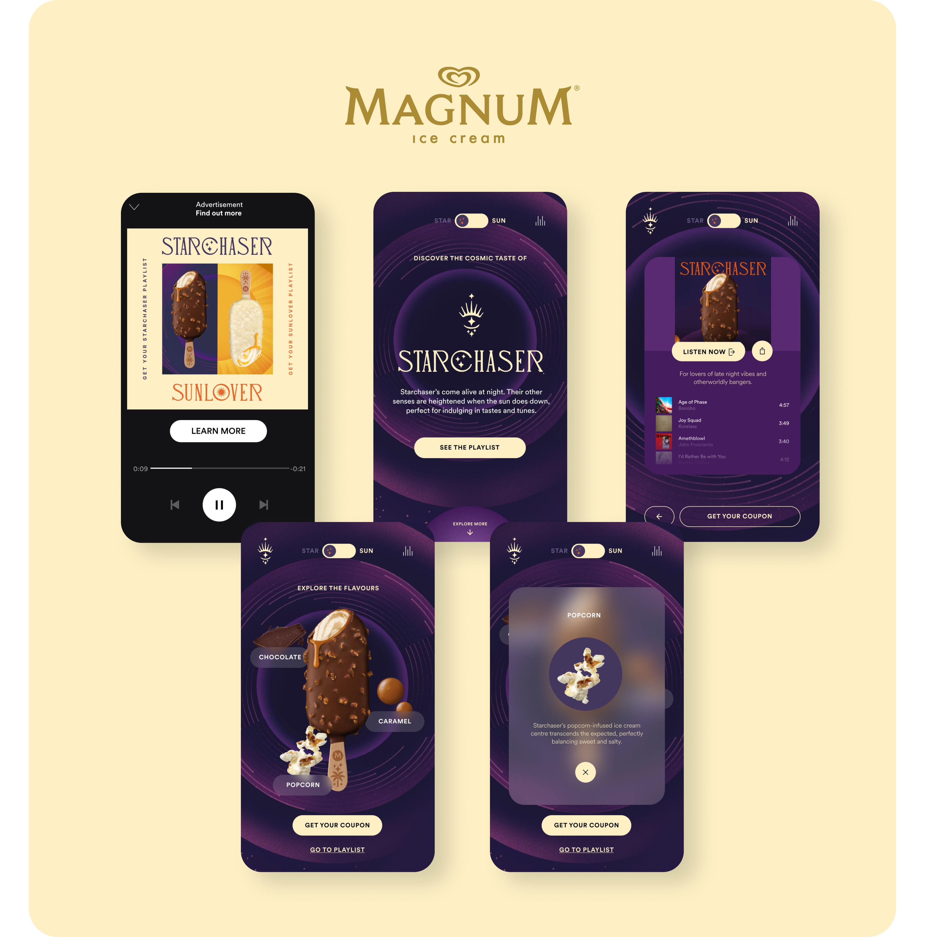 Upon clicking the ad, user data is analyzed to match them with either the Magnum Starchaser or the Magnum Starlover ice cream, along with music styles that reflect the essence of the chosen ice cream. Once paired with a flavor, users can explore the elements that make up that particular ice cream. Additionally, users can click on the toggle at the top of the microsite to "try" the other flavor and discover the associated music and ice cream elements.