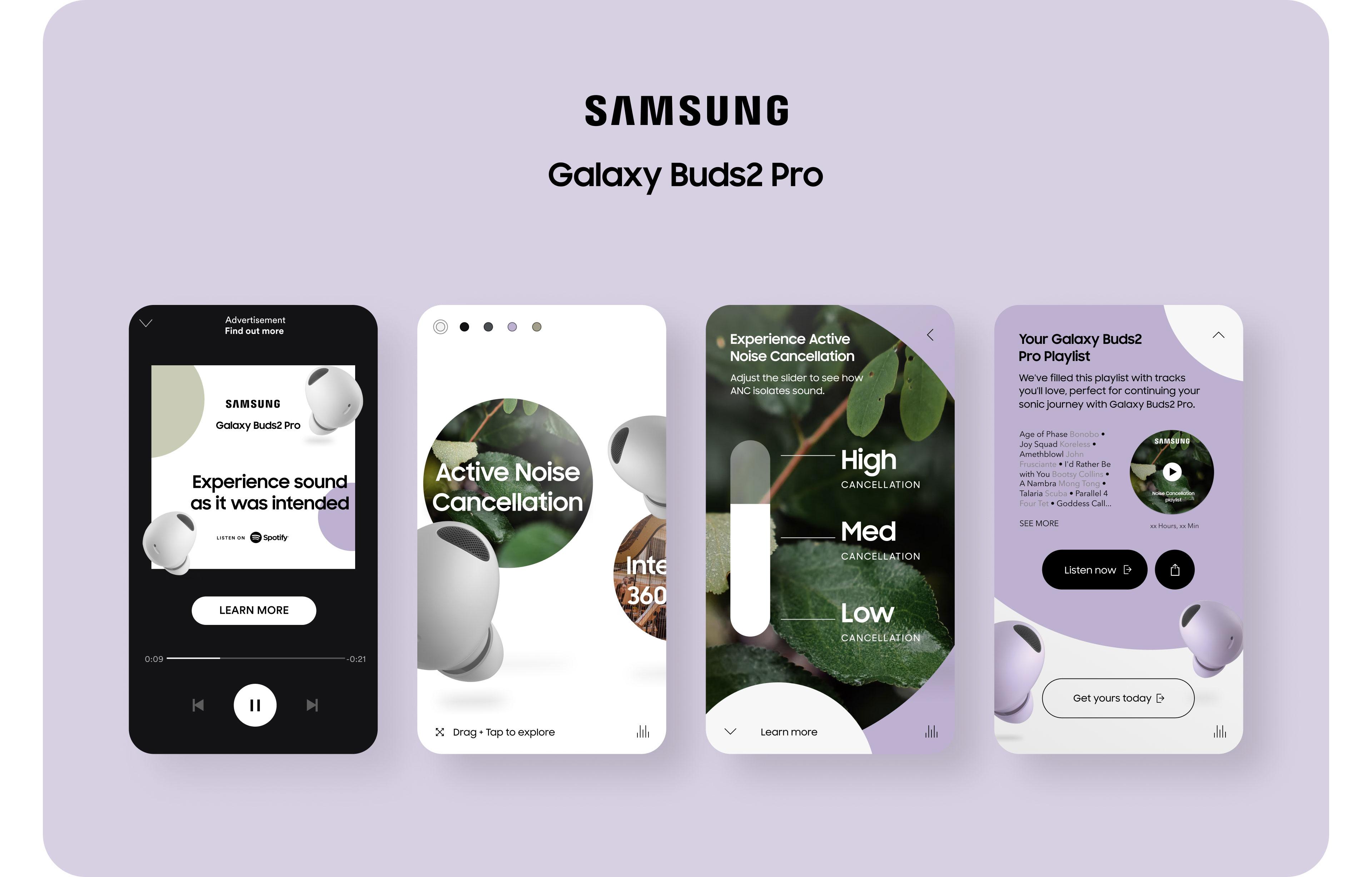 In this Samsung campaign concept, users can curate a personalized playlist tailored to their musical taste using the Spotify API. By interacting with various elements of the campaign aligned with Samsung Galaxy Buds 2 features such as colors, noise cancellation, intelligent 360 audio, etc., they can create a bespoke playlist that resonates with their preferences.