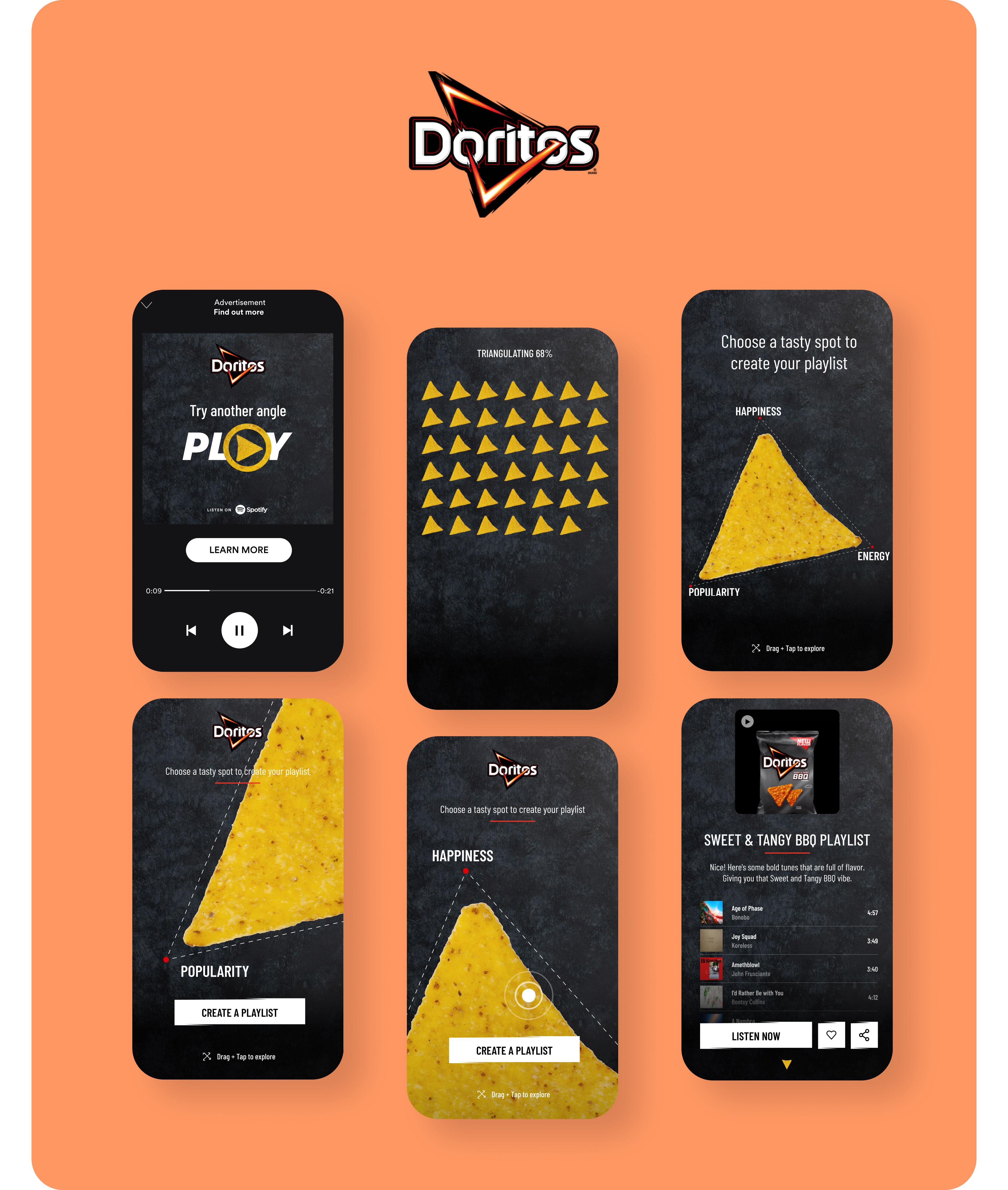 After clicking the ad, user data is collected to understand their overall musical preferences. Users can then create a bespoke playlist by interacting with different spots on the Doritos triangle, zooming and moving to select their desired area. Once chosen, users are matched with a Doritos flavor and receive a related playlist tailored to their taste.