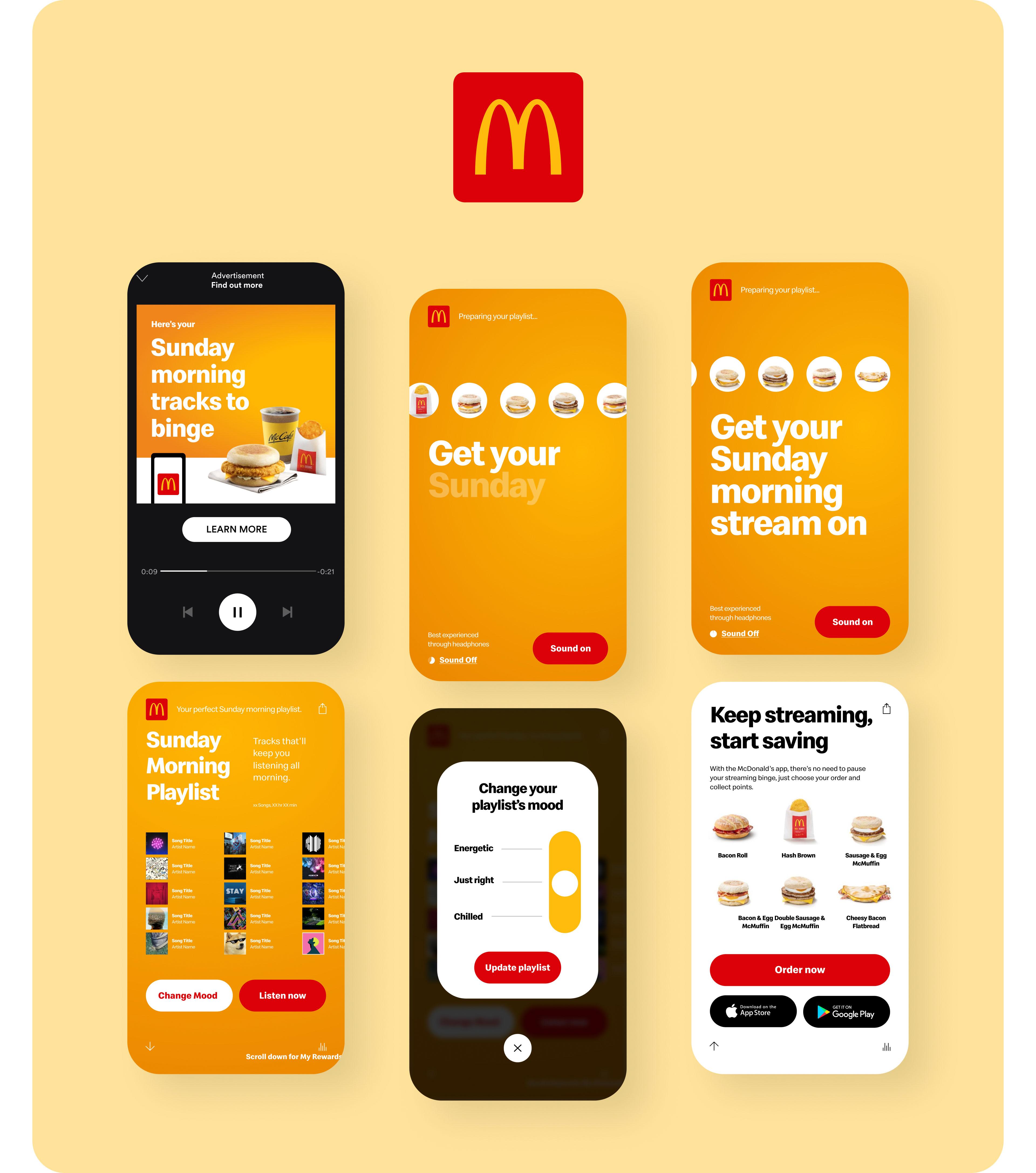 In this McDonald's campaign to promote the breakfast menu, users click on the ad, and their musical data is analyzed to provide a perfect playlist aligned with their musical tastes. On the payoff page, users can also generate a different playlist by adjusting the mood using a dedicated button.